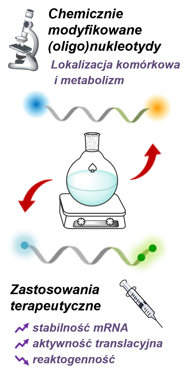 W Zakładzie Biofizyki prowadzimy interdyscyplinarne badania na styku chemii organicznej, biologii molekularnej oraz fizyki, koncentrując się na projektowaniu i syntezie chemicznie modyfikowanych nukleozydów, nukleotydów i oligonukleotydów. Nasze cząsteczki służą jako zaawansowane narzędzia molekularne, pozwalające na zgłębianie fundamentalnych procesów życiowych oraz tworzenie nowoczesnych technologii terapeutycznych.